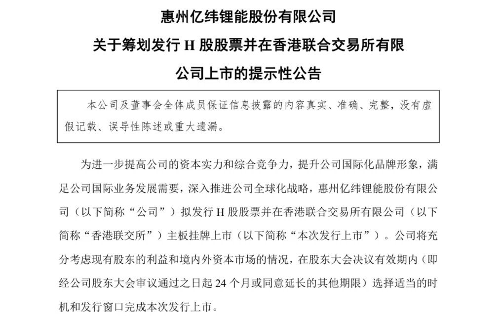 6月9日晚间,亿纬锂能披露公告,为进一步提高其资本实力和综合竞争力,提升国际化品牌形象,满足国际业务发展需要,深入推进全球化战略,拟发行H股股票并在港交所主板挂牌上市。